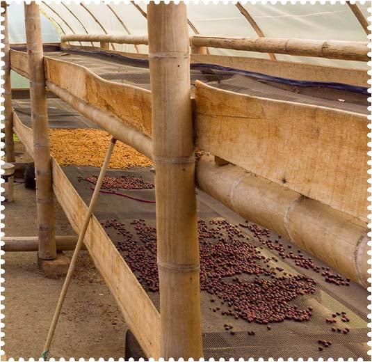 Von Hand gepflückt, wird Cascara auf Sonnenbetten getrocknet. Bei dem beginnenden Fermentierungsprozess entstehen die komplexen Fruchtnoten und die Süße.
